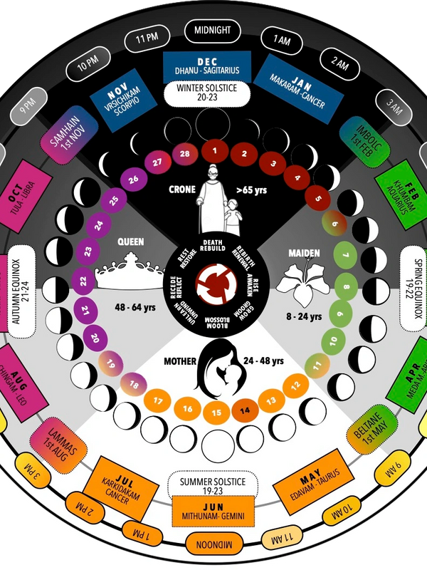 It was during my time at ITP within the Women's Spirituality Master's program that I got to explore, study and research Blood mysteries in-depth - its relevance in the shaping of culture and community, descent - death - birth myths and origin stories connected to it, the Wild instinctual Cyclic Nature of Blood, its lunar entrainment and attunement with other women and their wombs, the cyclic interconnectedness with Earth Rhythms, the energy of the mother - maternal - matrilineal, and the passing down of intergenerational trauma through and of blood. For me, the most powerful gift of Bleeding is the Spirituality of Menstruation. It carries within it the Interconnected Whole (as depicted by the Wheel) and connects wombs with the rhythms of the Sun, the Moon, and the planets of Solar System. This Life-Death Womb Rhythm in-forms the Inner intuitive navigational compass inherent within every female, and her womb. It influences the ebbs and flows of her physical, emotional, psychological, relational, creative and spiritual knowing. She is forever Changing on the Wheel of Menstruation. She inhabits the Body of the Earth. She wears Prakruthi (Nature). As a human female situates herself on this moving wheel, learns to attune her life within the waxing and waning of her womb biology, and allows it to carry her and do its work, she slowly starts moving into her own center of knowing from where she is free to Begin Afresh in every cycle. This Wheel came to me through my own process of integration. It has supported me to better understand the teachings of the tribal primitive Earth wisdom traditions. I continue to offer this knowing so we may learn to navigate our Ordinary steps on Earth within this Extraordinary Rhythm.