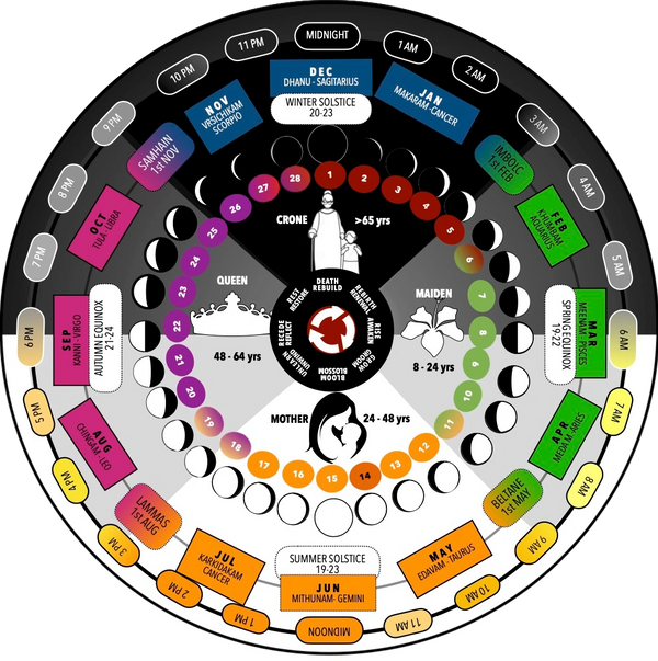 All our offerings are also, aligned on the Wheel of the Dark-Light Rhythmic Compass (Womb Wheel). It is often referred to as the Wom(b)en's Inner Navigational Compass. All our offerings make room for Wom(b)en's bleeding rhythm, her life cycle stage, and encourage wom(b)en to speak about it, claim it, and make room for herself on it.