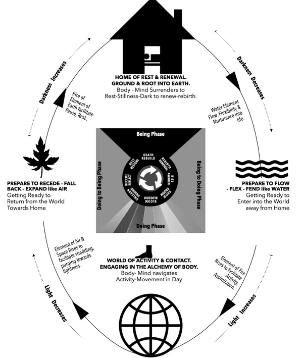 walks this rhythm with the changing light of the sun and the moon around the Earth. This Being-Doing rhythm is also, coded into the Human cellular biology. We are born as Human Beings and yet, Modern humans live like we are a 'Human Doing' to the extent of forgetting to rest, sleep, exhale, and slow down. Most people in modern times are exhausted, numb, over-stretched, over-activated, and running from one thing to the other without any time for settling and integration. This has to do with the internal trauma map that caused early disconnection and dissociation from the body.