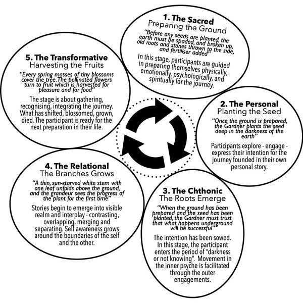 Organic Inquiry as a method supports this organic journey. It is linear, cyclic, expansive, deep and recursive. Within each stage the possibility of a new cycle opening is inherent. So while there is a linear cyclic flow, the process of Organic Inquiry can catapult a ripple effect that can go backward and forward, inwards and outwards, upwards and downwards. It is both time-bound and timeless in its unfolding.
